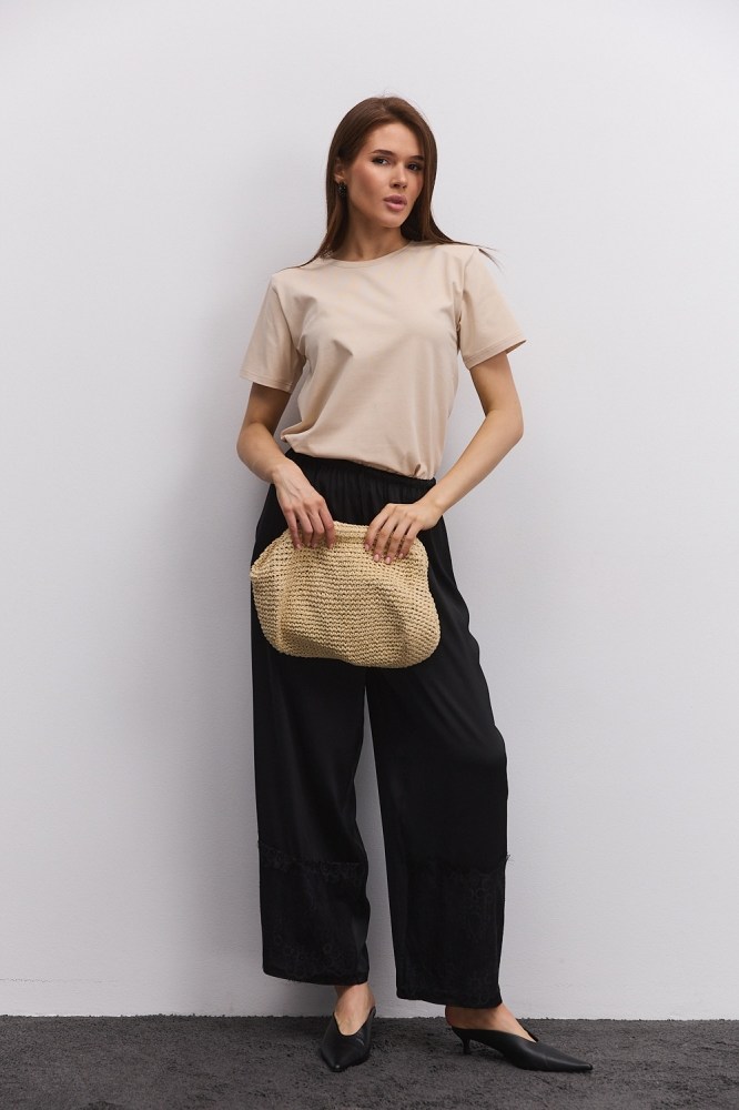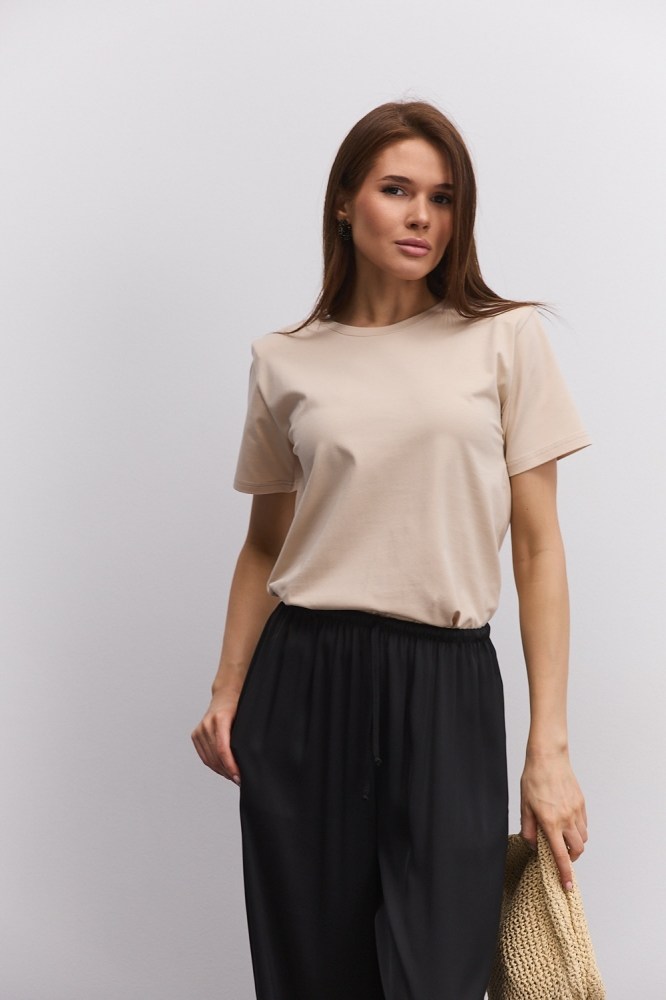 В базовом женском гардеробе непременно должна быть бежевая футболка. Это одна из тех вещей, которая будет выручать вас в разных ситуациях на протяжении всего года. Рабочие будни, отдых в неформальной обстановке, занятия спортом, загородные поездки – футболка бежевого цвета будет уместна везде, хорошо впишется в любой стиль, сочетаясь и с однотонными вещами, и с разноцветными. Также она послужит прекрасной базой для многослойных образов.