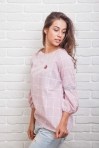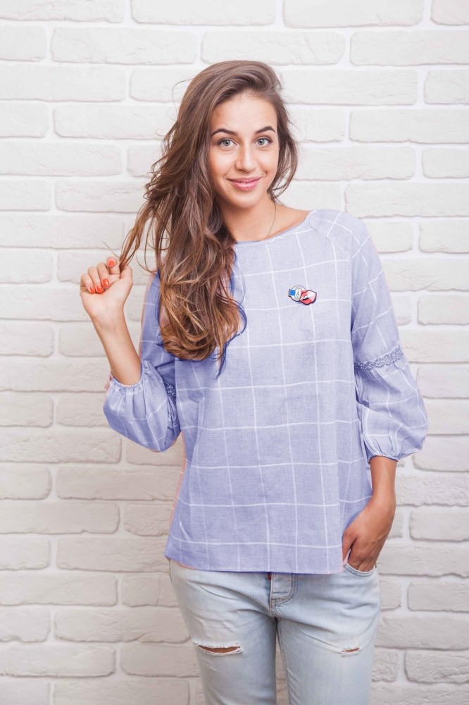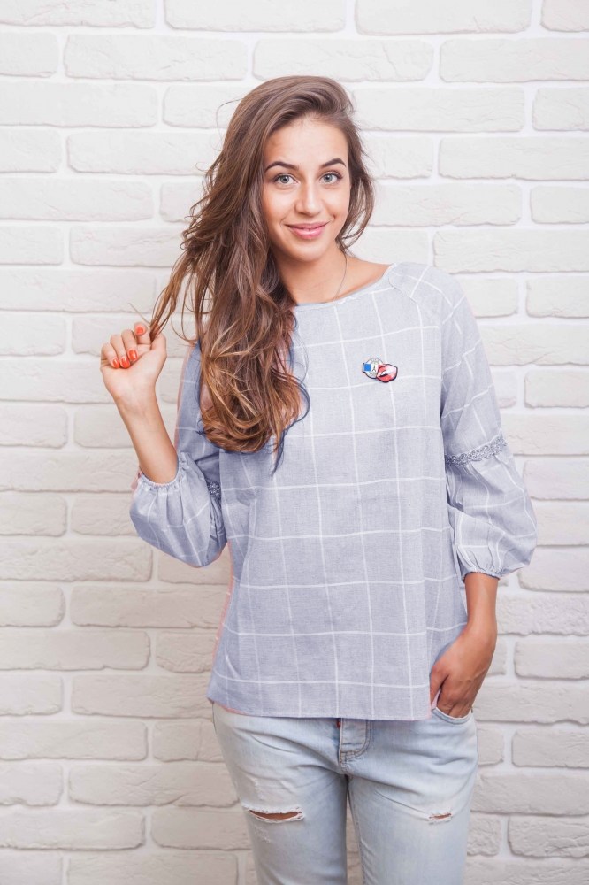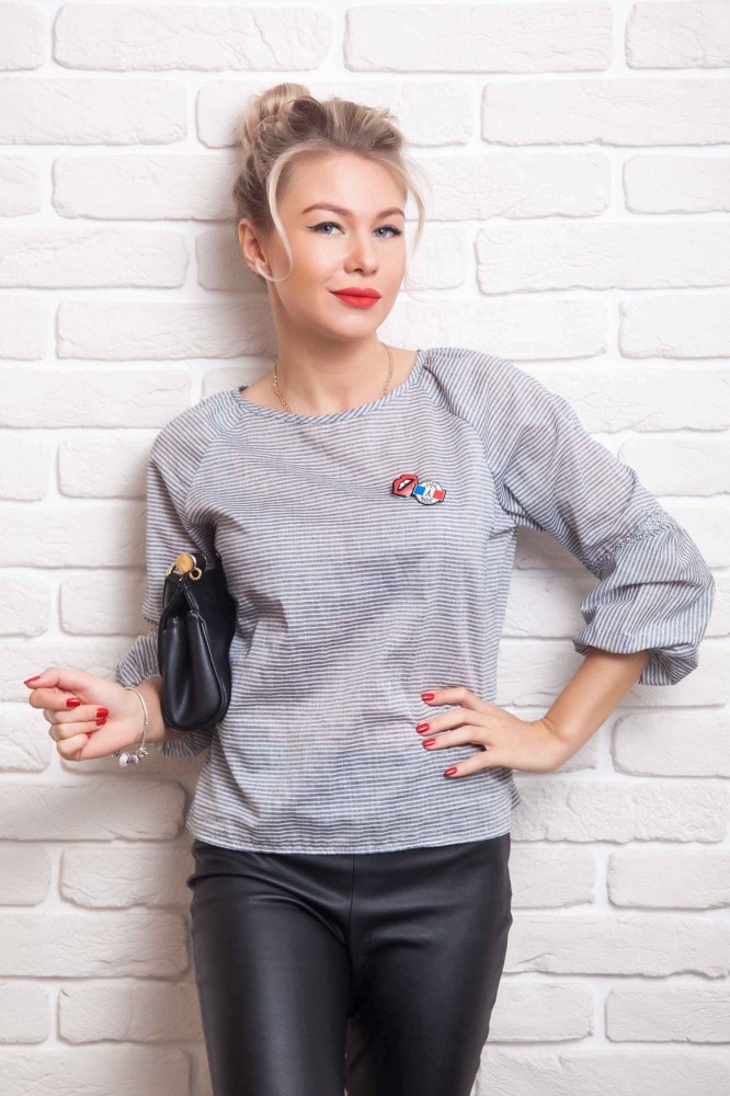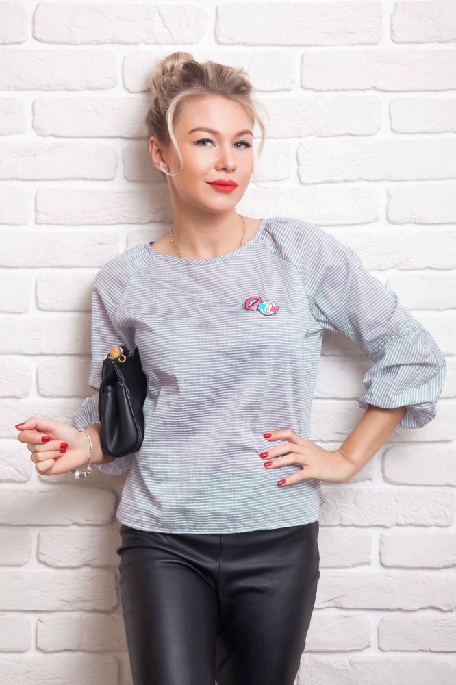 Эта легкая женская рубашечка подойдет как под юбку, так и под лосины и другие брючные изделия. Модель с рукавами-регланами, которые заканчиваются небольшими "фонариками" на резинке. На спине вверху застегивается на пуговичку. Горловина круглая, с окантовкой из основного материала, переднюю полку на груди украшает маленький значок в форме губ и Эйфелевой башни (фурнитура может меняться). Выбирайте расцветки из доступных на сайте и спешите оформить заказ напрямую у производителя!