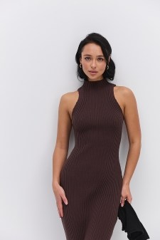 Трикотажное короткое платье кофейное со швами наружу