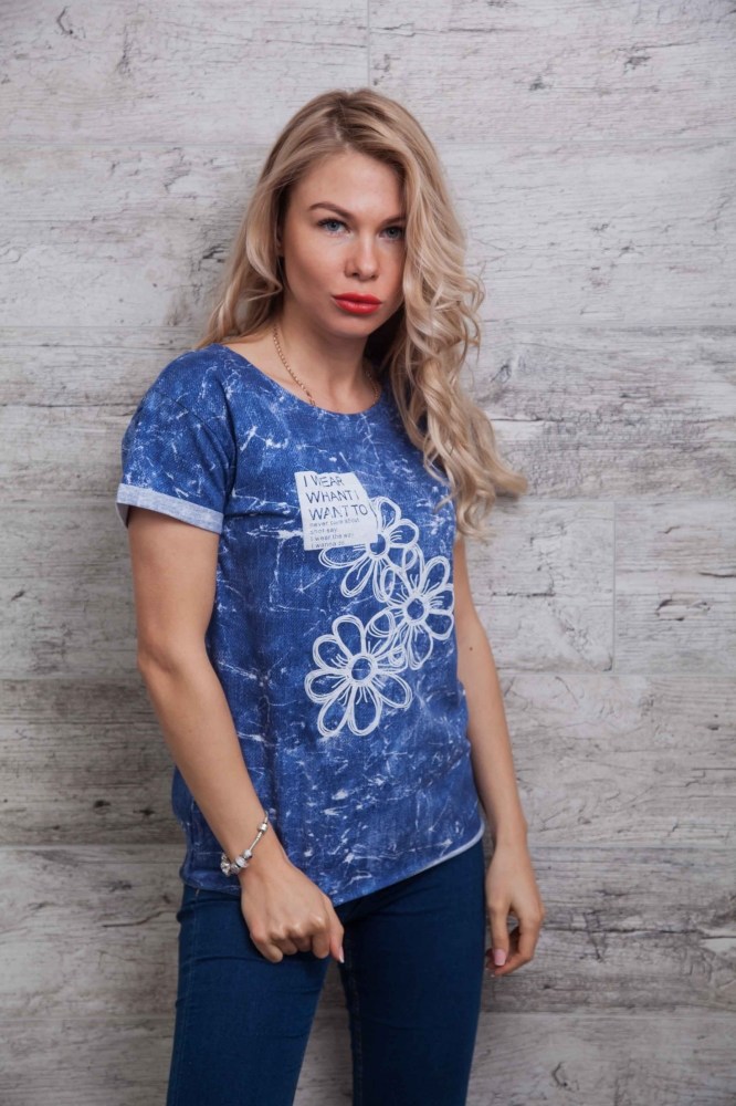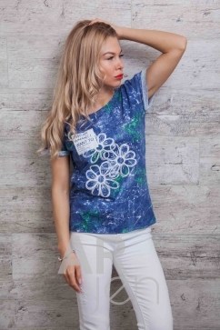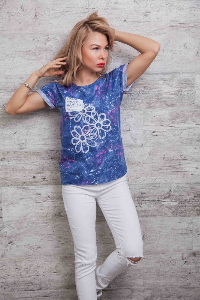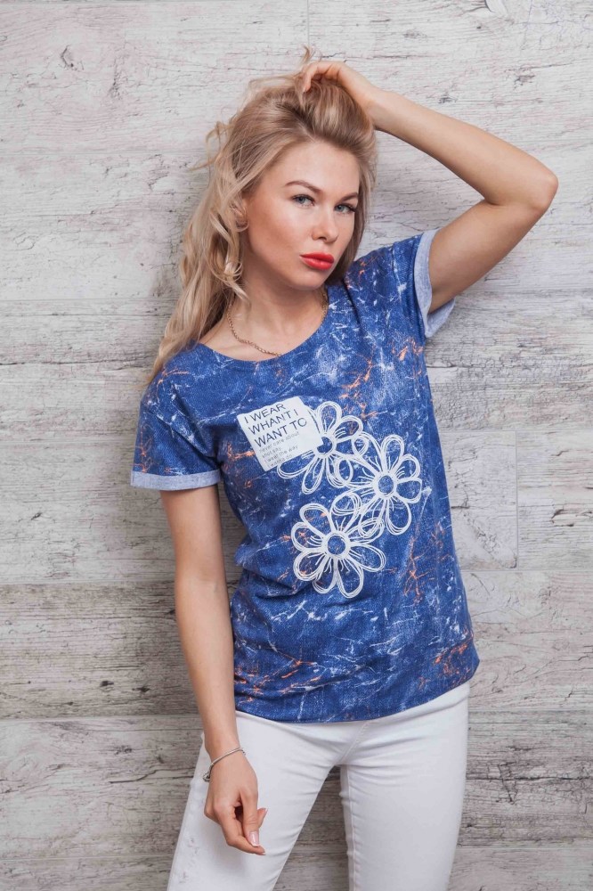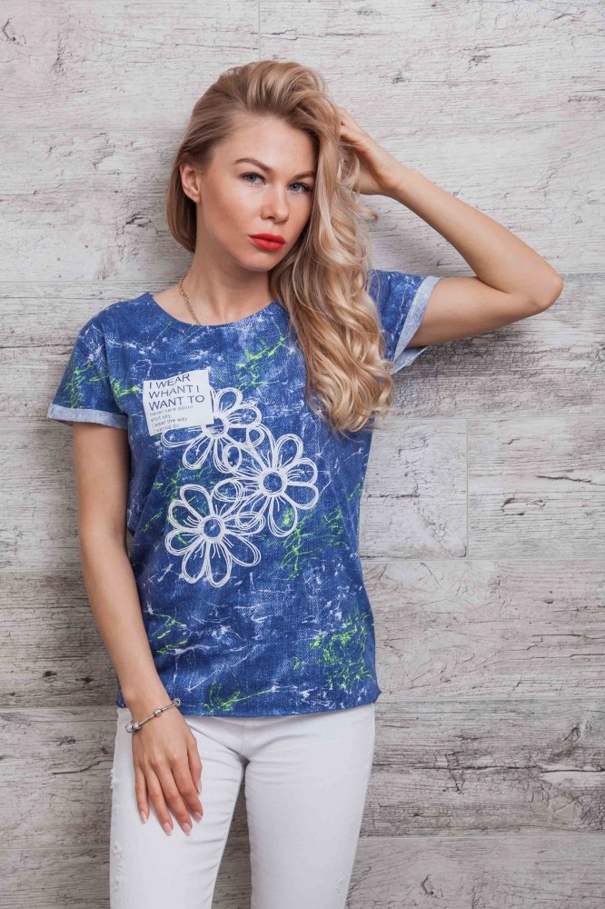 Эта яркая молодежная футболка отлично подойдет под джинсы или лосины. Модель идет с круглой горловиной, края рукавов подогнуты и пристрочены на наружную сторону, низ изделия прямой, обработанный оверлоком без подгиба. Передняя полка украшена притованным изображением ромашек, возле которых в прямоугольнике расположена надпись "I wear what I want to never care about shot say. I wear the way I wanna do". Спешите заказать модную новинку напрямую у производителя в нашем интернет-магазине женской одежды!