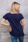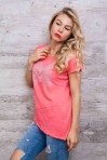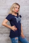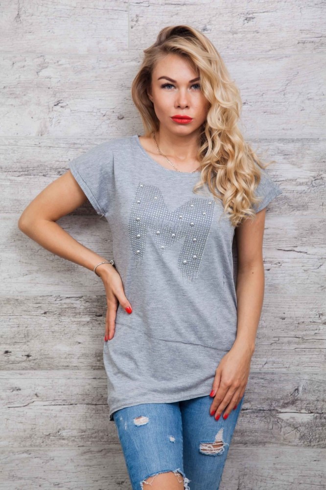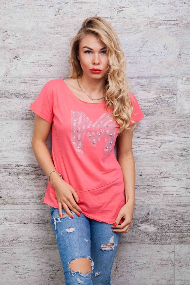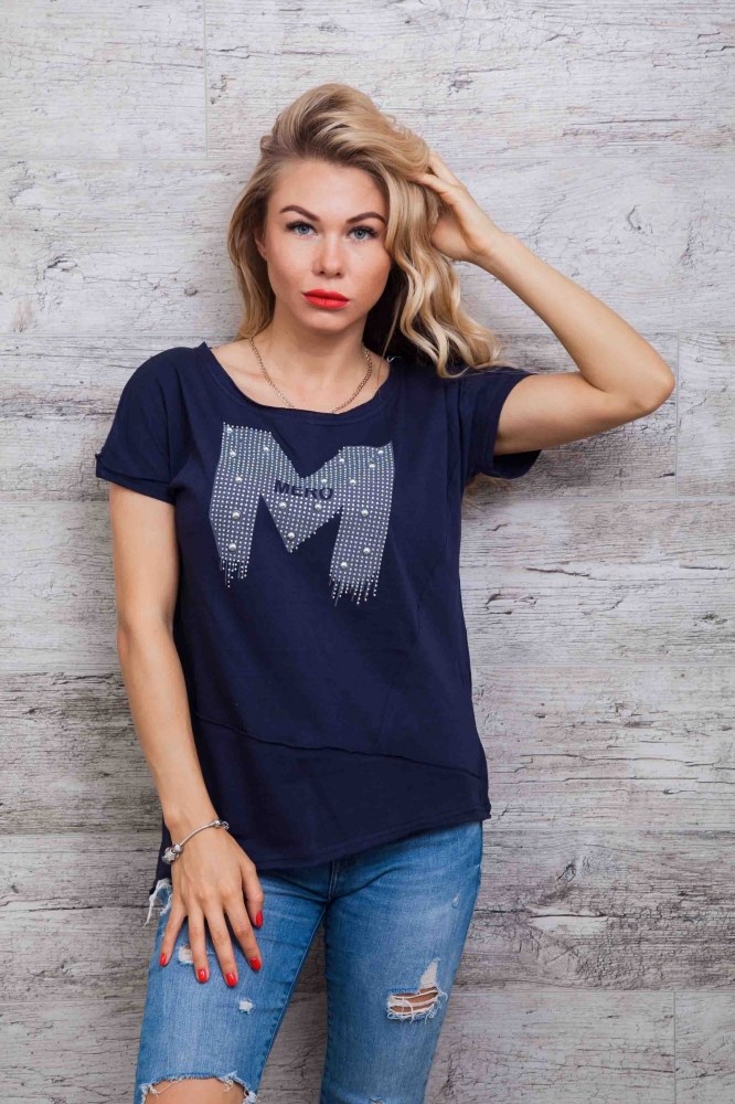 Эта летняя футболка понравится модницам, которые любят необычную одежду. Модель с цельнокроеными рукавами, края которых подогнуты в один подгиб и пристрочены на наружную сторону. Края круглой горловины и асимметричного низа идут срезанные. Передняя полка украшена большой принтованной буквой "М", которая полностью выложена стразами и дополнена серебристыми полубусинами. По центру рисунка расположено слово "MERO". Также на передней полочке есть два декоративных шва, расположенных под углом. Одевайтесь модно и оригинально, заказывайте женскую одежду нашего производства!