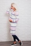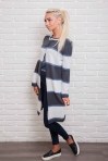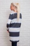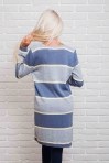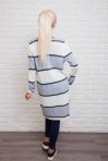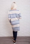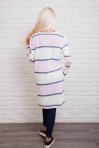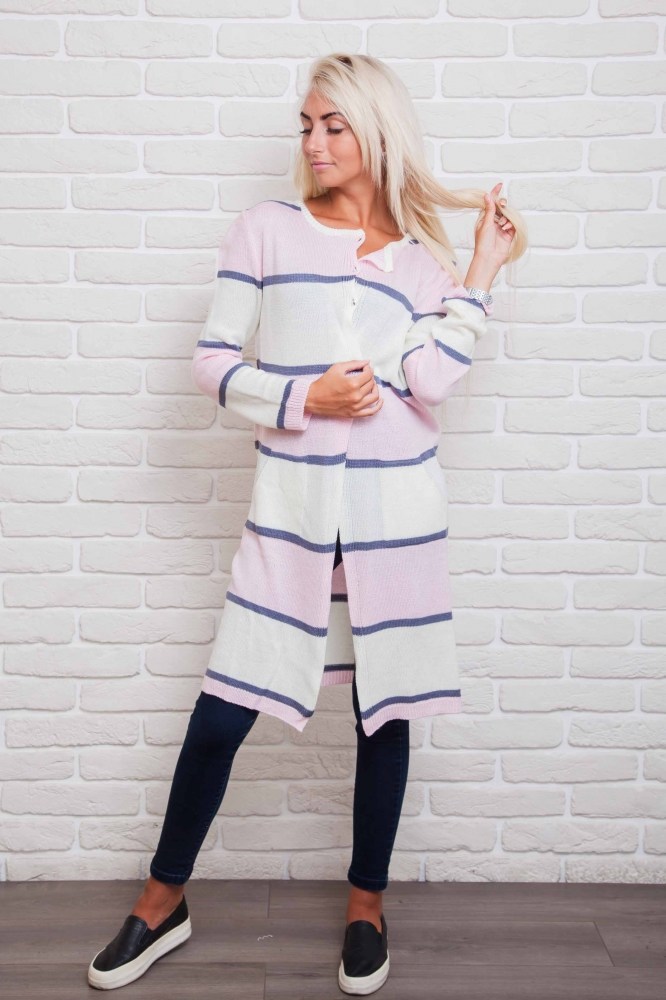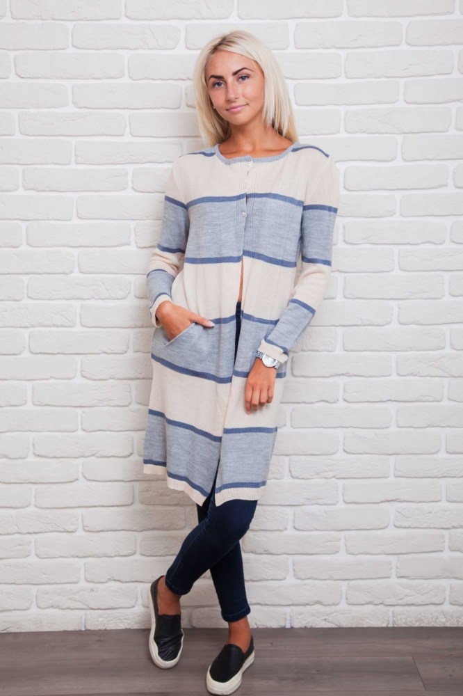 Этот удлиненный вязаный кардиган легко впишется в Ваш гардероб и защитит Вас от холода. Модель с длинными рукавами, горловина круглая, низ прямой. Спереди вверху застегивается на три пуговички, а чуть ниже талии есть два прорезных кармана. Главная особенность это кардигана - горизонтальные широкие полосы разных цветов, которые чередуются с узкими полосками. Спешите купить модную накидку из тонкой машинной вязки нашего производства по лучшей цене!