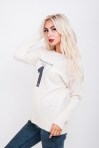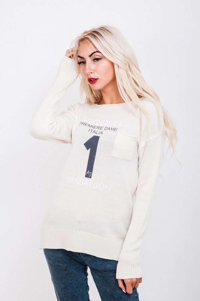 Эта вязаная женская туника не только подарит Вам тепло осенью и весной, но порадует своим оригинальным дизайном. Модель с удлиненной линией плеча и длинными рукавами, передняя полка короче, чем спинка. Края рукавчиков и низа идут с высокими вязаными манжетами, а края круглой горловины немного закручены наружу. Спереди кофточка украшена принтованными надписями "Vicolo premiere dame Italia 1 sensatuon", а слева на груди пришит небольшой накладной карманчик. Спешите заказать модную удлиненную кофту напрямую у производителя в нашем интернет-магазине!