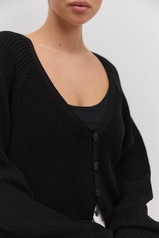 в`язаний жіночий кардиган від виробника Arjen і тепло та затишок подарує, і фінальні акценти у твоїх звичних аутфітах розставить. Коротка модель виконана в техніці "резинка" і спереду застібається на великі ґудзики у формі сердець (в різних партіях фурнітура може змінюватися). Краї прямого низу і довгих широких рукавів закінчуються щільною в`язкою у вигляді вузької манжети. Кругла горловина доповнена бейкою з тонкою гумкою, вшитою по краях. Обирай