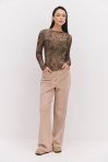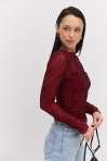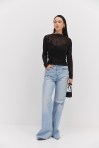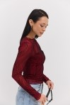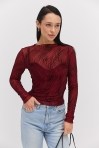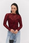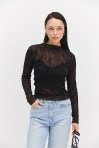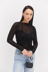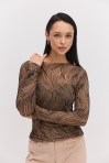 лонгслівом жіночим від виробника Arjen ти точно будеш у центрі уваги на будь-якій події! Модель пошита з еластичної напівпрозорої сіточки, декорованої з лицьової сторони набивними геометричними візерунками, що створюють неповторний візуальний ефект. Краї довгих рукавів, прямого низу та короткого суцільнокроєного коміра оброблені роликовим швом без підгину. Така річ легко впишеться у твої святкові та повсякденні аутфіти, гармонійно поєднуючись з класичними