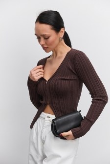 в`язана кофта від українського виробника "Аржен", доповнена акцентними плечиками, допоможе тобі зустрічати новий сезон модно та з комфортом! Ця модель з довгими рукавами повністю виконана з дрібної машинної в`язки в рубчик та доповнена поролоновими накладками, вшитими у плечах. Краї низу прямі, а кругла горловина доповнена коротким коміром-стійкою з гумкою на краях. Такий верх стильно виглядатиме у поєднанні і зі в`язаними або трикотажними спідницями нашого виробництва, і з різноманітними