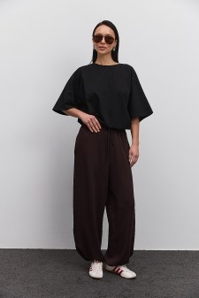 модними жіночими джогерами? Ця модель від Arjen вирішить твою дилему завдяки прямому низу на кулісці з гумкою-шнуром та фіксатором з внутрішнього боку, що дозволяє змінювати силует виробу за настроєм та ситуацією. Вгорі штанів вшита широка гумка та є зав`язки зі шнурка, а в бічних швах розташовані зручні прорізні кишені. В інтернет-магазині "Аржен" ти можеш