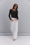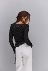 жіночий лонгслів з асиметричним низом. Ця модель, пошита з напівпрозорого квіткового гіпюру, йде з довгими рукавами, круглим вирізом горловини та асиметричною лінією низу, подовженою на один бік. Усі краї виробу оброблені роликовим швом без підгину. Замовляй