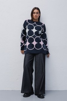 в`язаної модної кофти від українського виробника "Аржен" вкраде твоє серденько в новому сезоні! Модель у стилі оверсайз виконана з машинної в`язки лицьовою гладдю із ниток трьох кольорів та прикрашена геометричними візерунками, які візуально ділять виріб на три широкі смуги і разом створюють незвичайний візуальний ефект. Прямий низ та довгі рукави закінчуються однотонними манжетами, а кругла горловина обшита однотонною бейкою з тонкою гумкою по краях. Плечі в кофтинці подовжені. Обирай