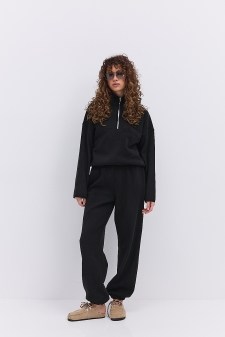 в`язаний костюм для жінки - просто знахідка як на осінньо-весняний, так і на зимовий сезон! Комплект зі светром та штанами подарує тобі тепло і комфорт, при цьому елегантно виглядаючи з різноманітними тренчами та пальтами. Цей костюм повністю виконаний з машинної в`язки в широкий рубчик. У штанах краї низу прямі, а в поясі вшита широка гумка. Светр oversize іде з коміром-стійкою з подвійної в`язки в дрібний рубчик і спереду вгорі застібається на коротку металеву блискавку. Рукави у виробі довгі, краї низу прямі, спинка подовжена, а бічні шви закінчуються короткими розрізами. В інтернет-магазині ти можеш