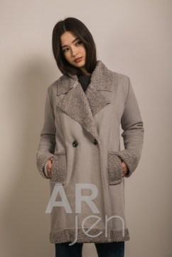 стильные пальто и дубленки из эко-замши, которые выглядят очень эффектно! В этой модели наружная сторона гладкая, а изнаночная - с коротким кудрявым ворсом, мягким на ощупь. Пальто идет с длинными рукавами, края которых отогнуты и пристрочены наружу пушистой стороной, как и края прямого низа. Воротник отложной, спереди изделие застегивается по центру на две большие пуговицы. В вертикальных швах, расположенных спереди, на уровне талии есть два прорезных кармана, края которых также украшены пушистыми отворотами. Чтобы