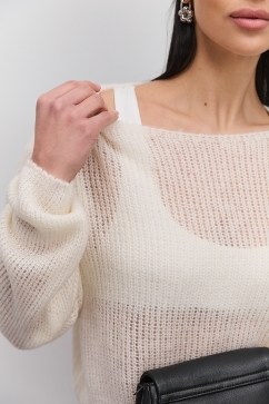 Стильно и с комфортом завершить многослойные образы летом и межсезонье может не только белая рубашка, а еще и молочная вязаная кофта в сеточку. Ее ажурная вязка станет главной изюминкой твоих нарядов.