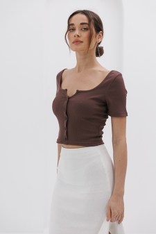 Коричнева футболка, оздоблена кремовим окантуванням, легко впишеться в ділові, повсякденні чи спортивні аутфіти. Практична і стильна, вона стане твоєю улюбленою базовою річчю.