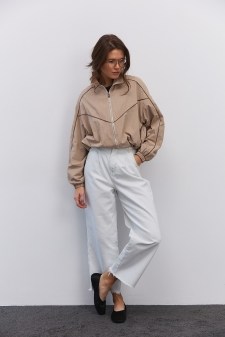 женская куртка, выполненная в стиле модной дубленки - как раз то, что тебе нужно! Модель пошита из мягкой эко-замши с гладкой наружной стороной и мягкой кудрявой изнанкой. Края длинных рукавов и прямого низа отогнуты и пристрочены наружу как манжеты, воротник отложной. Спереди есть два прорезных кармана на молнии, а ближе к левому боку вшита застежка-молния. "Изюминкой" образа стали горизонтальные либо вертикальные швы на изделии с выведенным наружу необработанным краем ткани на рукавах, спереди и сзади. Такая