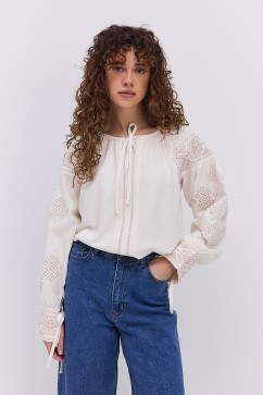 современная женская вышиванка гармонично впишется не только в праздничные, но и в деловые модные образы, сочетаясь с классическими брюками или брючными костюмами, всевозможными юбками и джинсами. В модели длинные рукава-регланы полностью украшены геометрическими узорами, которые повторяются на кокетке и манжетах, и отличаются в центральной части. Машинная вышивка по всему изделию выполнена в технике гладью мелкими столбиками. Круглая горловина обшита узкой окантовкой, которая спереди переходит в завязки. Высокие манжеты на объемных рукавах также завязываются на шнурки, выполненные из основного материала. Края низа прямые, боковые швы заканчиваются разрезами, а спереди по центру вшита планка с разрезом вверху и вышитыми по всей длине зигзагами. В