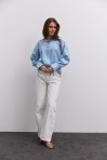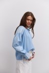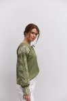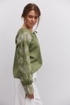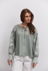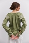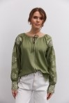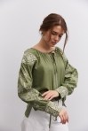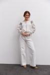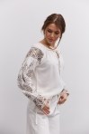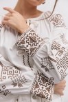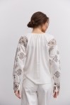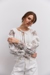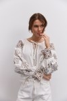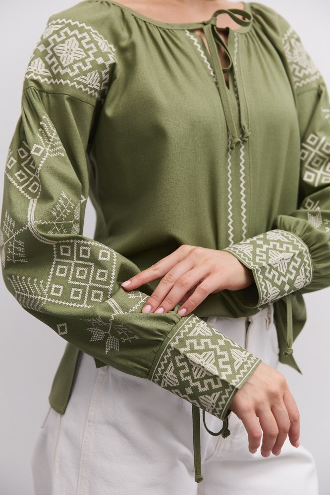 современная женская вышиванка гармонично впишется не только в праздничные, но и в деловые модные образы, сочетаясь с классическими брюками или брючными костюмами, всевозможными юбками и джинсами. В модели длинные рукава-регланы полностью украшены геометрическими узорами, которые повторяются на кокетке и манжетах, и отличаются в центральной части. Машинная вышивка по всему изделию выполнена в технике гладью мелкими столбиками. Круглая горловина обшита узкой окантовкой, которая спереди переходит в завязки. Высокие манжеты на объемных рукавах также завязываются на шнурки, выполненные из основного материала. Края низа прямые, боковые швы заканчиваются разрезами, а спереди по центру вшита планка с разрезом вверху и вышитыми по всей длине зигзагами. В