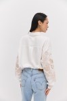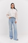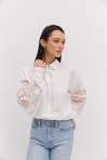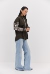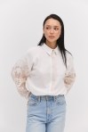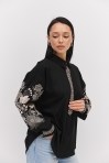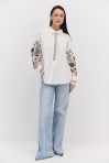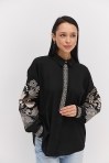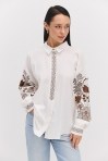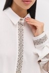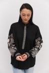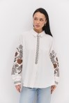 вышиванке женской от производителя "Аржен". Модель идет с круглой горловиной, которая застегивается на пуговицу и дополнена рубашечным отложным воротником на стойке, и с полукруглым низом. Длинные рукава по центру украшены цветочными мотивами из машинной вышивки гладью. Манжеты декорированы геометрическими узорами крестиком и застегиваются на пуговицу и петельку из резинки. Спереди по центру блуза полностью застегивается на пуговички, скрытые декоративной планкой с такой же вышивкой вверху, как и на манжетах. Это прекрасная альтернатива базовой