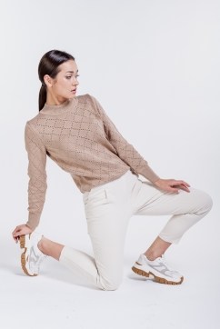 Модная вязаная кофточка из ажурной вязки уже сама по себе смотрится интересно, поэтому тебе понадобится минимум аксессуаров для завершения образа. Эта модель полностью украшена ажурными ромбами, а спереди дополнена несколькими ромбиками из фактурной вязки. Короткий воротник-стойка, манжеты внизу изделия и на длинных рукавах по краям обшиты тонкой резинкой. Такой стильный джемпер можно сочетать практически с любым низом. Выбирай