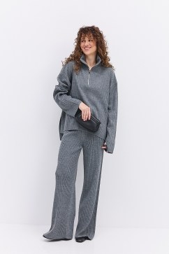 Женский вязаный костюм с юбкой и кроп-топом с длинными рукавами светло-серый