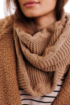 Теплый шарф нейтрального бежевого цвета окутает вас шармом и завершит образ ненавязчивым акцентом. При этом вовсе не обязательно иметь шапку такого же оттенка, что значительно упрощает подбор аксессуаров.